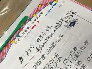 開始時間ギリギリで焦って教室に入ったとき、驚きました。すでに20人くらい居たのですが、シーンと静かだったのです。というのも、みんな手話でおしゃべりをしていました。「わ、どうしよう・・・。手話できないよ・・・。」と思わず心の中で嘆きました。近くにいたスタッフの方に、「手話ができないのですが、参加して大丈夫ですか?」と聞いたら、(その方は耳に障害のある方で)” こっちおいで ”と手で誘導してくれました。異言語脱出ゲームを行うためにすでにグループに分けられていて、私は教室の一番奥のグループに入りました。すでに手話で盛り上がっていたし、その会話の輪に入れない・・と怖さを感じていました。「開始時間までお互いに自己紹介をしていてください」とスライドに書かれていて、私を含めた6人で自己紹介が始まりました。私の番になったとき、とっさに、配布資料にペンで名前と事情を書いて伝えたら、” うんうん “ と言って、” じゃあ、そらって呼ぶね” とそらの手話(パーの手を左から右に動かす)を教えながら伝えてくれました。「よかった、受け入れてくれた・・。」とちょっとした安堵感が生まれました。